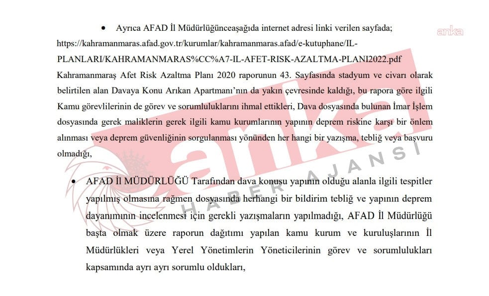 Bilirkişi raporunda, Kahramanmaraş İl Afet ve Acil Durum Müdürlüğü tarafından hazırlanan “Kahramanmaraş İl Afet Risk Azaltma Planı (İRAP) 2020” raporunun 43. sayfasında, stadyum ve çevresi olarak belirtilen riskli alanın dava konusu Arıkan Sitesi’nin yakın çevresinde yer aldığı ifade edildi.