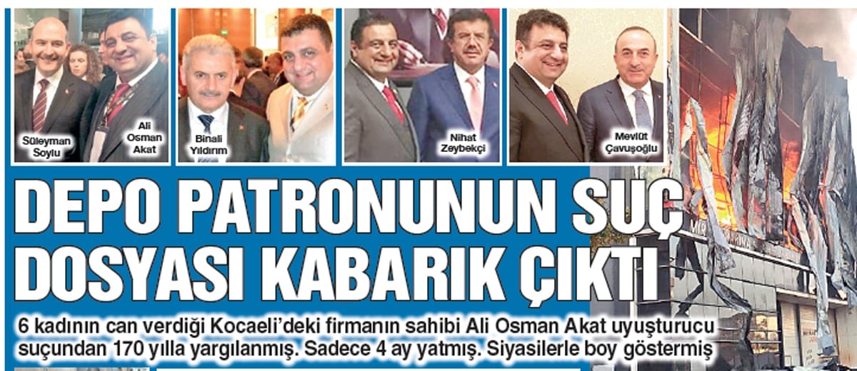 Kocaeli’nin Dilovası ilçesinde 6 kadının yanarak hayatını kaybettiği parfüm şirketinin sahibi Ali Osman Akat’ın pandemi döneminde TBMM’ye dezenfektan ve kolonya sattığı ortaya çıktı. SÖZCÜ, önceki günkü manşetinde Akat’ın AKP’li siyasiler Süleyman Soylu, Binali Yıldırım, Nihat Zeybekçi ve Mevlüt Çavuşoğlu ile olan fotoğraflarını gündeme getirmişti.