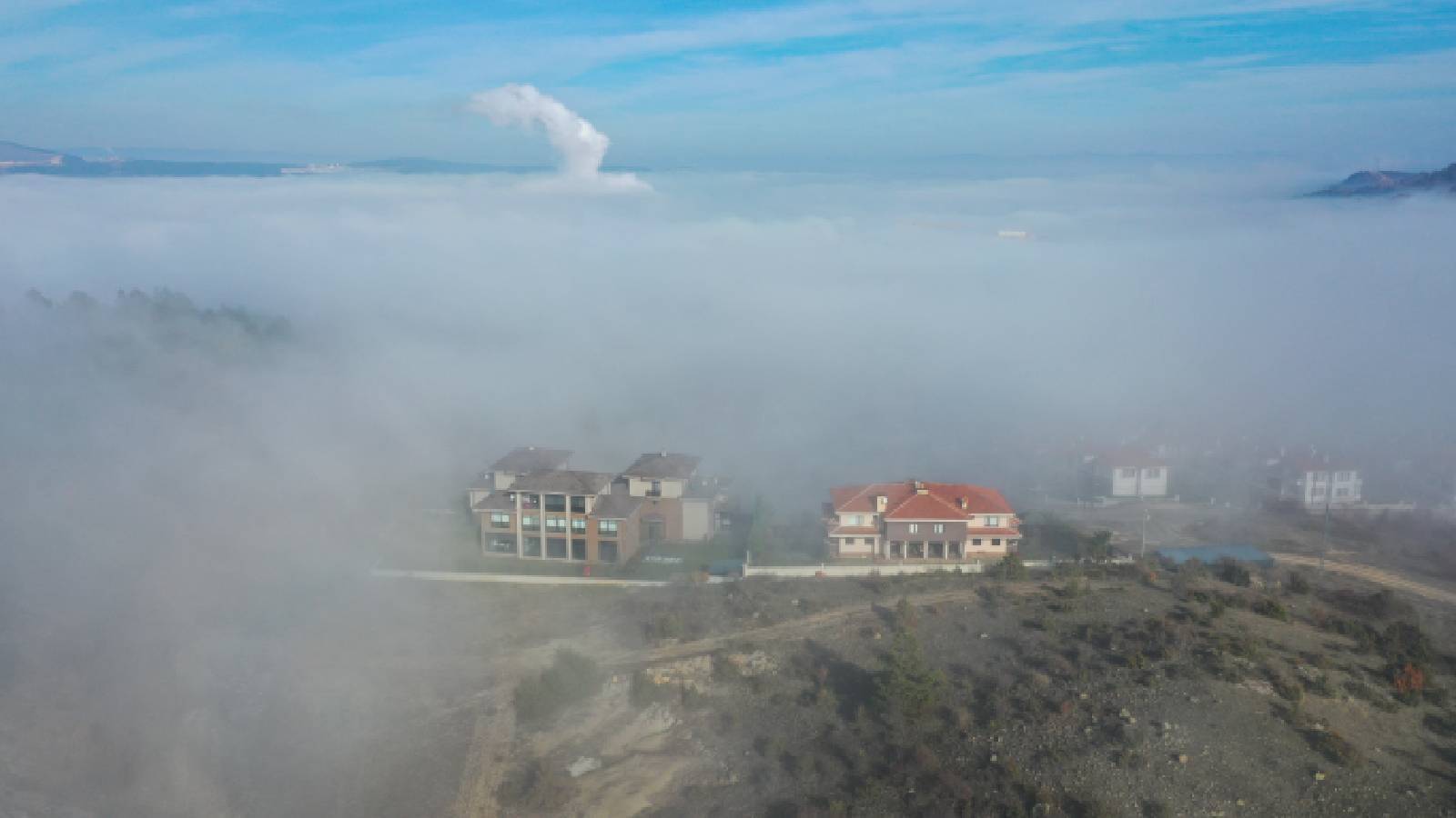 Sis bulutuyla bütünleşen manzara, dronla görüntülendi. (AA)